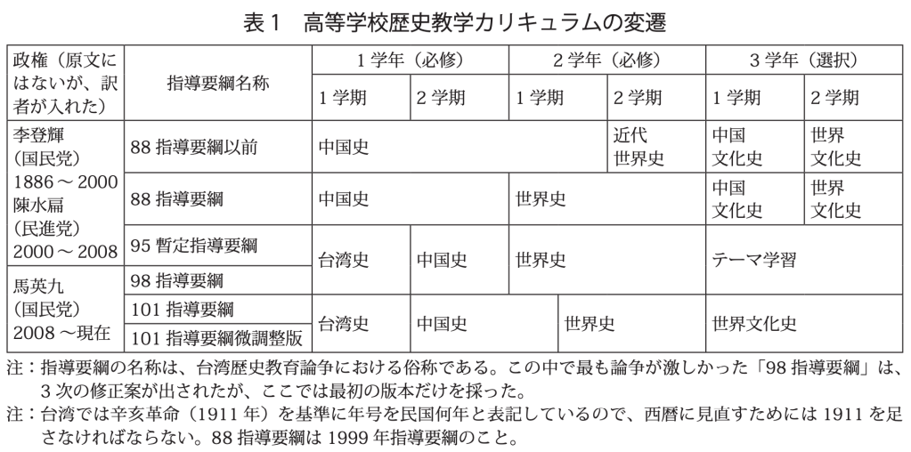 [1]本文中、台湾歴史教育の争点に関する部分は張方遠編,『高中歷史指導要綱烽火錄:從90指導要綱到101指導要綱的變革與爭論』(臺北:海峽學術出版社,2013)を主に参考した。この本には、歴史教育の争点に対する各種の評論および基礎資料が収録されている。