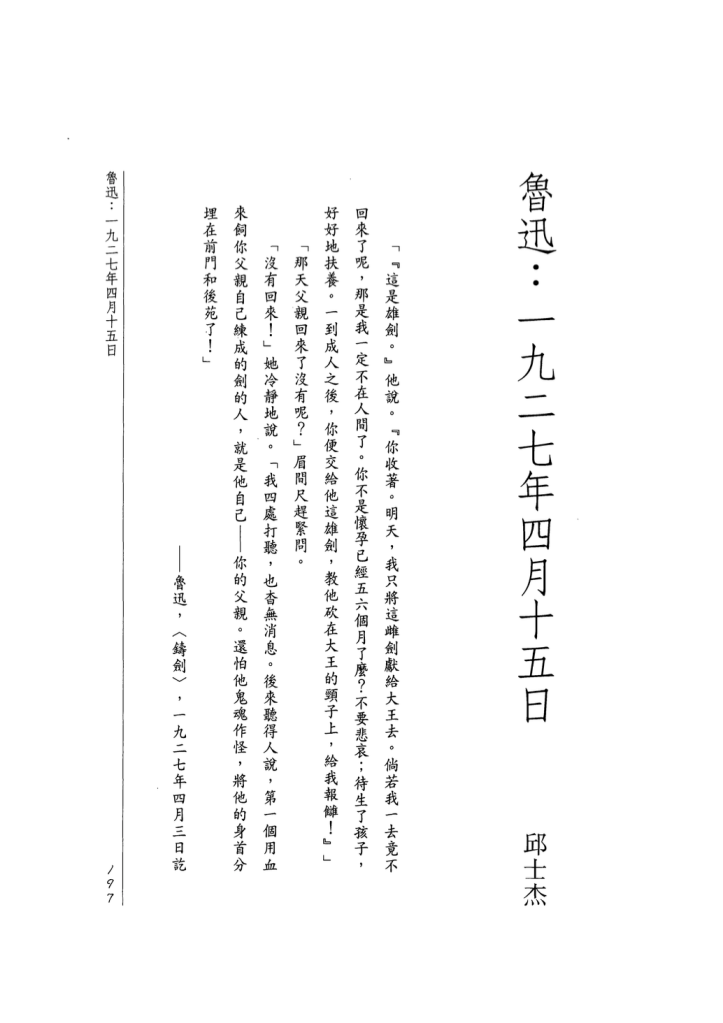 文件資訊:邱士杰(2006)。〈魯迅:一九二七年四月十五日〉。《人間思想與創作叢刊》﹐2006年秋季號(台北)﹐197-208。同文並曾節選發表於《新國際》。