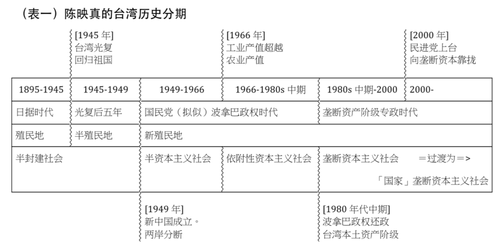 第一點。陳映真認為殖民統治應以台灣本土資產階級的不發展作為相適應的後果──他認為,日據時代大力扶植日系壟斷資本並打壓台灣人,所以台籍資本家才沒有在台灣人民之間形成一個階級(資產階級)。與此相比,雖然國民黨政權接收了日系壟斷資本的財產,卻不排斥讓台灣人發展資本主義。[40]