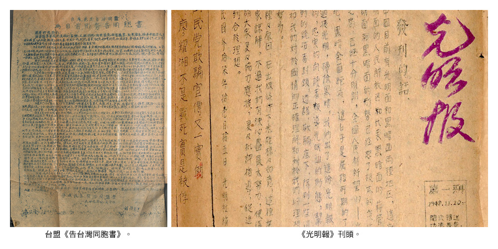 台盟在1949年《人民日報》發表的「七七」通電眾所周知,但7月10日接著發表的台盟《告台灣同胞書》直到今日才重現人間。文中指出:「本盟成立於一九四七年十一月,其目的在團結全省同胞與反動派美帝國主義及其走狗作殊死戰,兩年來在敵人的高壓恐怖統治下埋首苦幹,最近已與人民解放軍取得聯絡,並相互同意,…按照人民的意志,建立台灣人民的民主自治政權,在新中國的大家庭中共存共榮。」