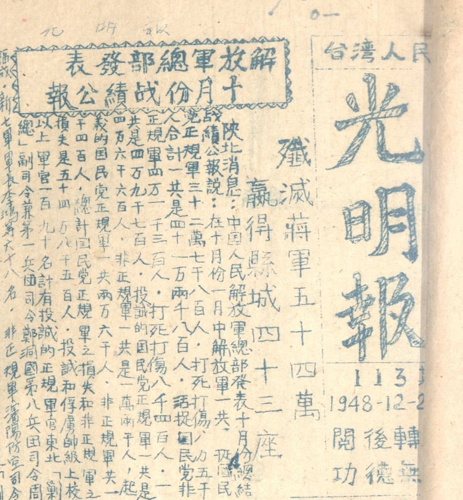 各期《光明報》的內容集中在人民解放軍的戰況捷報,以及對新華社廣播的轉抄,但也有不少關於台灣的報導。特別是楊克煌、謝雪紅在大陸參加各種開國組織,對於陳誠治台當局的批判,紀念二二八事件,以及聲援1949年「四六事件」遭鎮壓的台大師大學生。