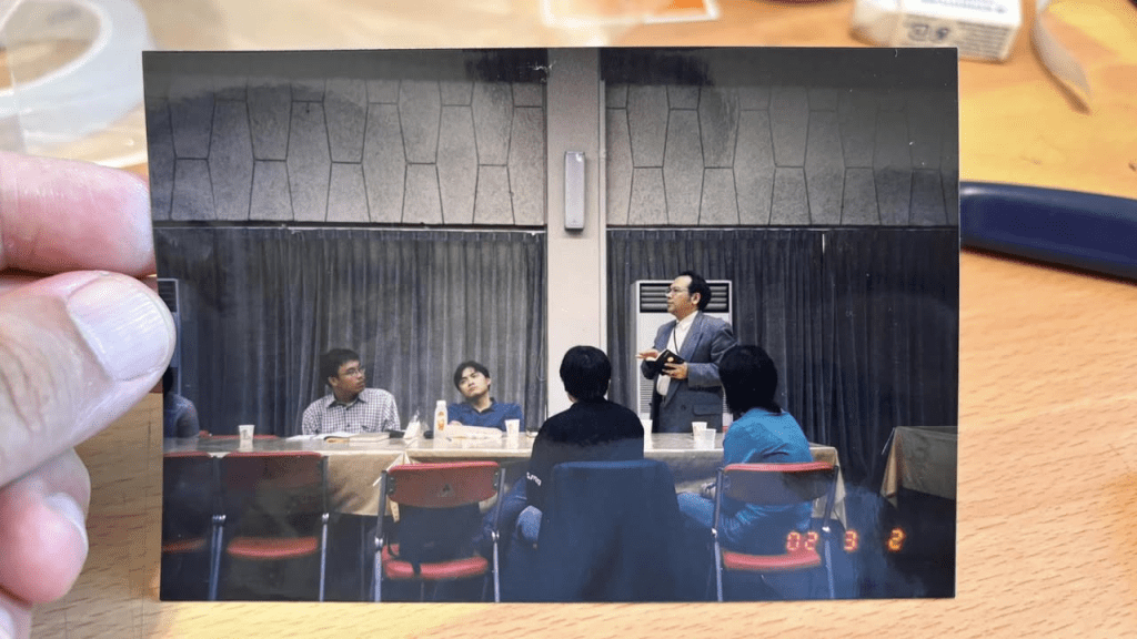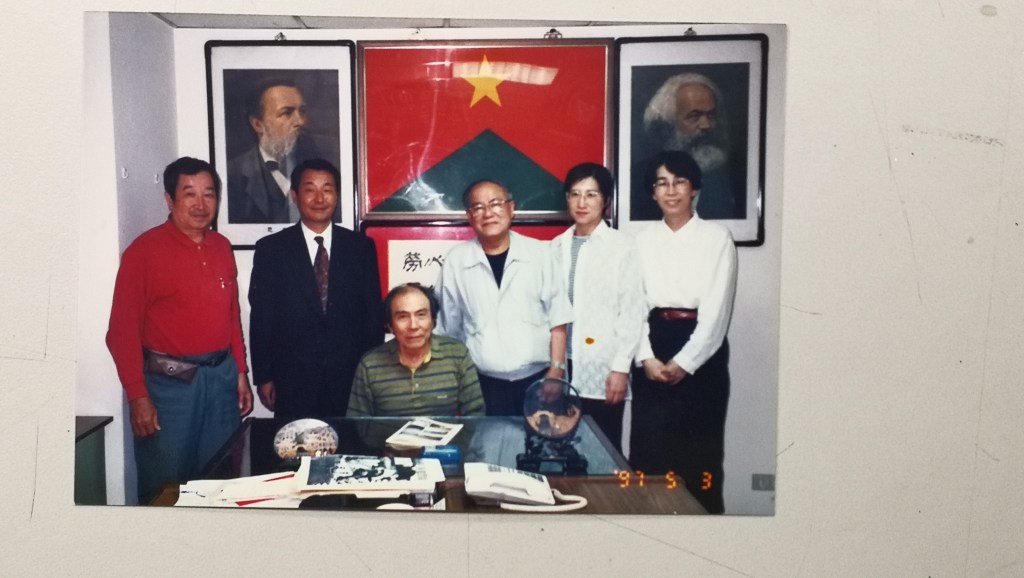 我翻到了一張他在台北接待橫地先生一行的相片。那是他們在勞動黨黨旗和馬克思恩格斯像前的合影。是橫地先生為擴大自己的地圖而在台北留下的足跡。林書揚先生在相片背面寫道: