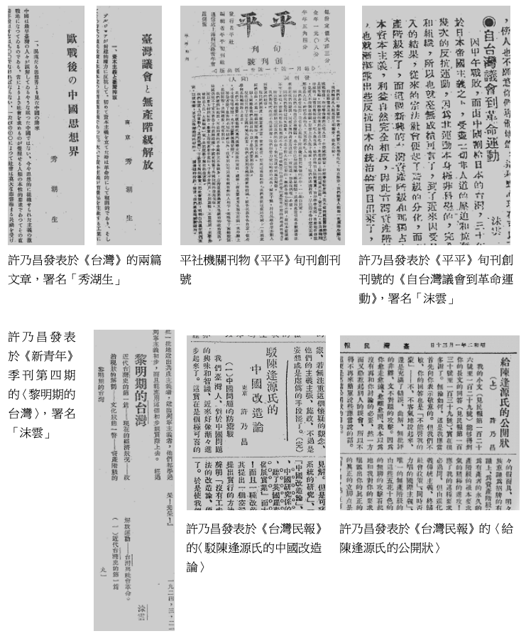 許乃昌前往蘇聯之前所寫的文章,在台灣史上創下許多「第一」,起了思想啟蒙的先驅作用。〈歐戰後の中國思想界〉是台灣第一篇介紹二○年代初期大陸思想界狀況的文章。當時「問題與主義論戰」、「社會主義論戰」剛結束,改良主義者與社會主義革命派各以組織的形成或人際之間的分化作為論戰總結。[37]身處於「激烈赤化中之中國」的許乃昌認為: